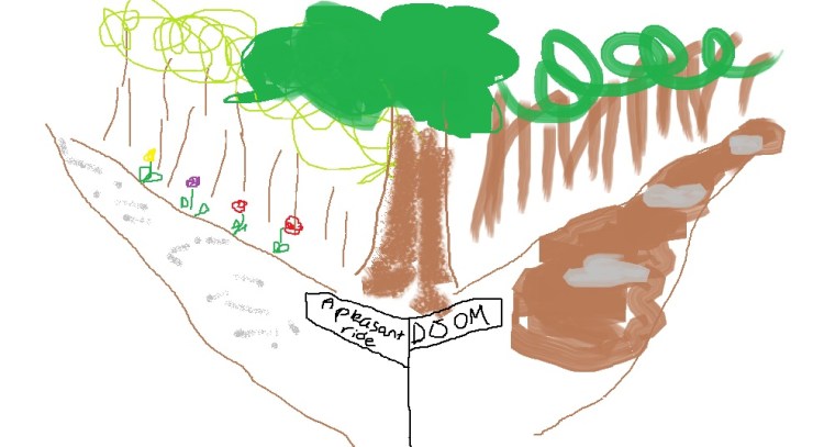 I spotted a dirt track leading into woodland off the main road. Feeling adventurous, I went for it. It was all going well – it was a little muddy here and there but nothing by trusty steed and spectacular riding skills couldn’t handle – until I came to a fork in the track. It looked like this: