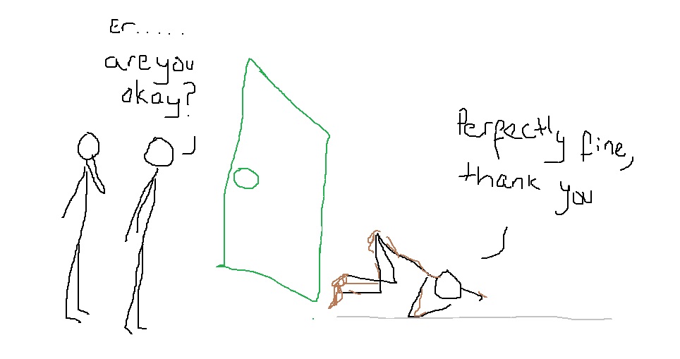 I eventually arrived home. I stumbled to the front door, peeled off my mud-caked expensive trainers and my mud-caked socks, opened the door, and had to crawl through the hallway on my hands and knees to prevent getting my mud-caked feet on the carpet. Just as my mud-caked bum was in the air, the neighbours chose this point to pass by, and, obviously alarmed by the sight of me on my hands and knees in the middle of my hallway with the front door wide open, they gingerly inquired after my health.