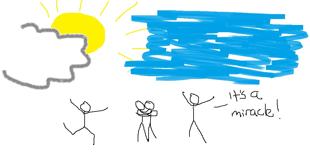 But then something strange happened. One Friday evening, the dark clouds parted to reveal a blueness that was so blue, a lot of people didn’t know what to do about it, and started reconsidering their previous knowledge of what it means to be blue. Then, as if that wasn’t peculiar enough, a very bright orb appeared in the blue, which was so bright that those people who looked directly at it were irretrievably blinded and spent the rest of their days in blackness; but for the majority of the people who didn’t look directly at the bright orb, it was a time of tremendous celebration: it meant that the days of darkness were, for now, over.