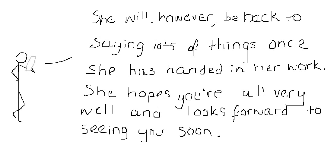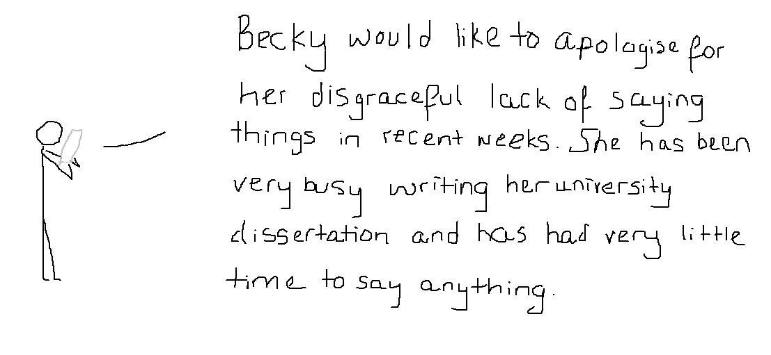 Haha oh no! That’s terrible! This is precisely why I had Stick Man read my apology, because I don’t want people to make the effort to follow me and then think I’ve buggered off!