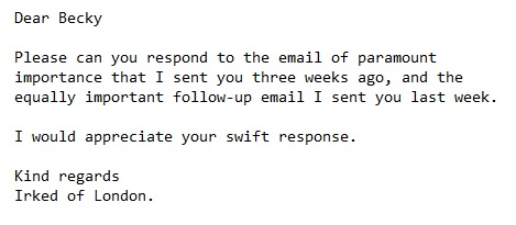So you got on your high horse about people not responding to your emails. You curse their incompetence and their appalling rudeness. You would never do such a crass and unprofessional thing. Then you receive the following email: