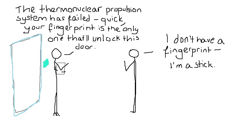 What do you mean it can tell when I’m not looking at it? How can an inanimate object tell when I’m not looking at it? That’s ridiculous. I’ve just got used to the preposterous fact that some telephonic devices can use our fingerprints to unlock them. Listener, fingerprints can only be used to unlock things in spacey-future movies, like Men in Black and Star Trek. In spacey-future movies fingerprints can also be used to unlock slidy doors that go phhht in whitewashed, neon-lit corridors populated with men in shiny black suits and immaculately made-up women with severe haircuts carrying clipboards and talking about xeno hackers infiltrating their nuclear centrifuges.