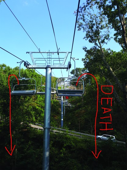 A couple of hours later we were sailing high above the mangle of shrubs and trees as a ski lift hoisted us up the mountain, our bare feet dangling in the hot air, our knuckles whitening and our colons twitching at the beautiful yet almost-certain-death below us.