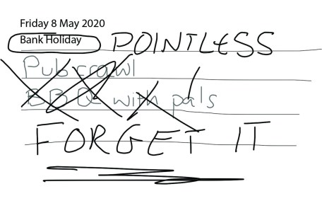 Happy Bank Holiday! Isn’t it wonderful to have a Bank Holiday on a Friday! What a novelty! What an absolutely wonderful excuse to go for a mass picnic in this beautiful weather, or to cram into a pub garden and drink pint after pint of ice cold beer! What an absolute MOCKERY OF OUR CURRENT INCARCARATION.