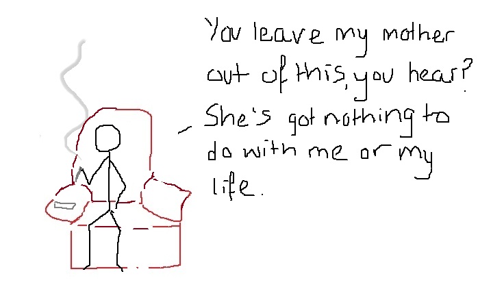 So you’re estranged from her? Did she walk out on you as a child? Did she abandon you? Were you abandoned, Stick Man? Were you abandoned as a child?