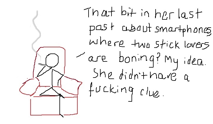 Stick Man, you show a lot more of yourself in these blogs than you think you do. You allowed yourself to portray a woman who’d just lost her virginity in Becky’s post about Fifty Shades of Grey. I mean, that either takes a very gutsy actor, or a stick man who secretly yearns for the innocence his mother took away from him when she abandoned him as a child.