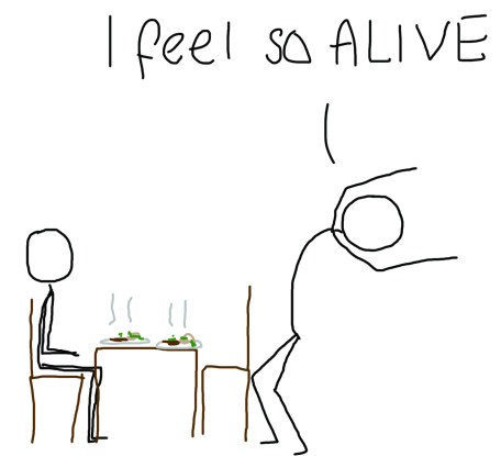 And what of this? You are at a restaurant. You are in great company. You have ordered your food. Your companion is scintilating, witty and beautiful, and is offering you the best that social small talk can proffer. But all you can think is whereismyfoodwhereismyfoodwhereismyfoodwhereismyfood.