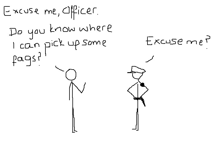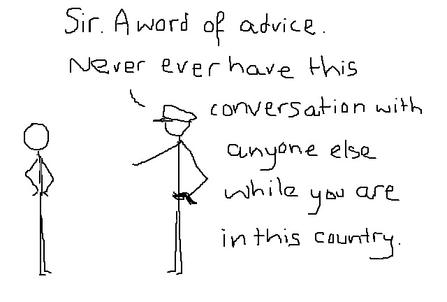 But perhaps the greatest example of a potentially fatal translation problem comes from a friend who had the following conversation with a policeman (or police officer, if you will) in Manhattan, New York, at around midnight. In the late ’80s.