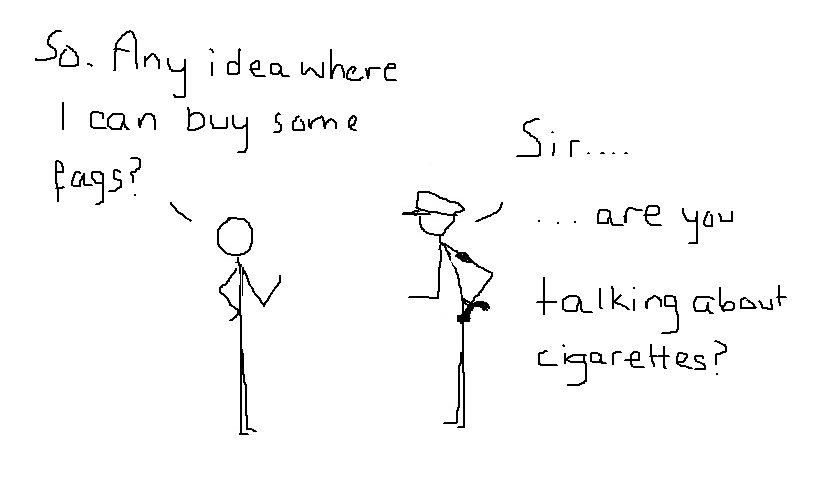 So, my lovely American buddies, the next time an English person chortles manically when you say you’ve got an itchy fanny, or gapes bemusedly when you say you need to straighten your bangs, or whispers ‘Sss’ when you say ‘Do the Math’ (it’s Maths, America, Maths), you know why. We’re not being rude, we’re just confused.